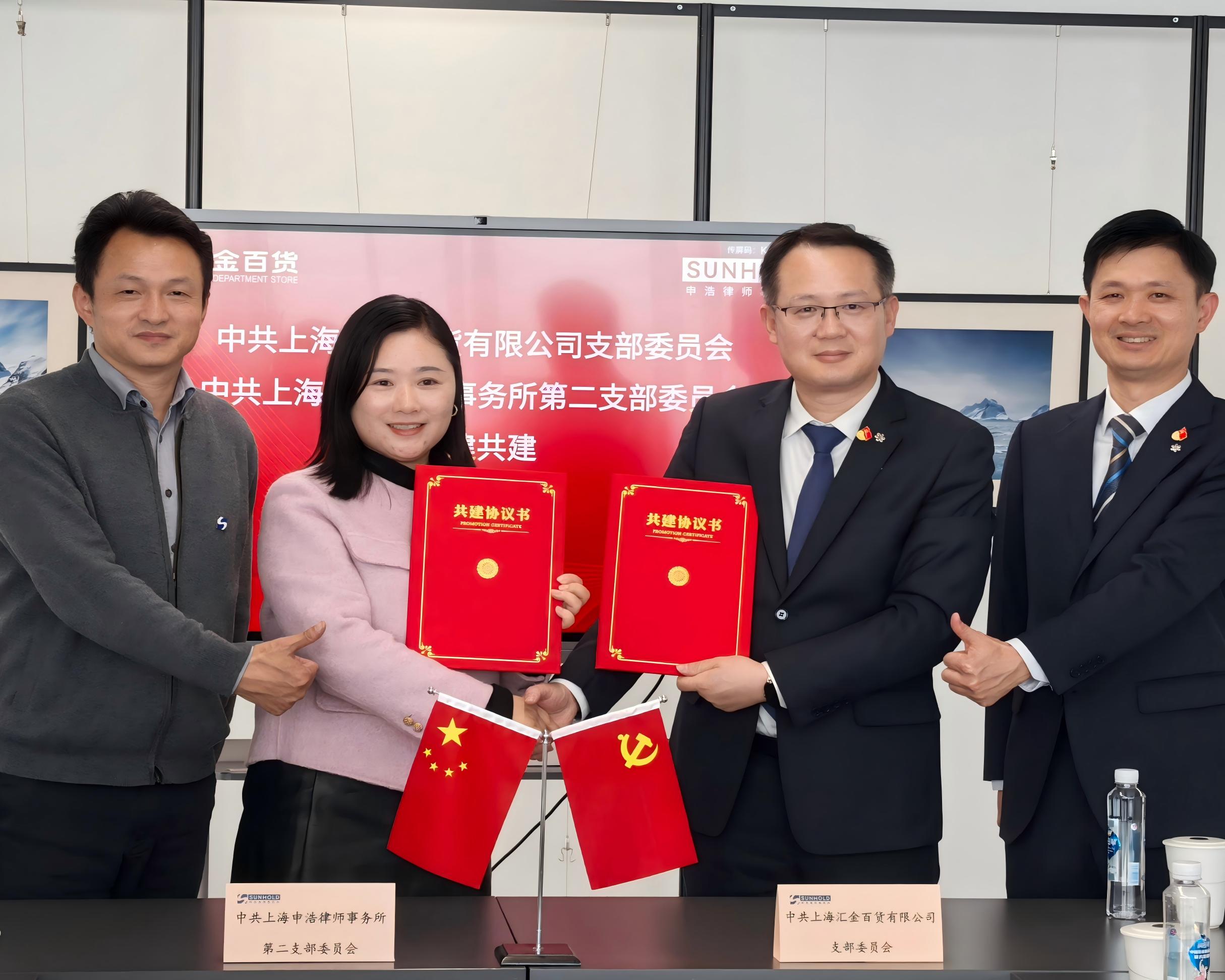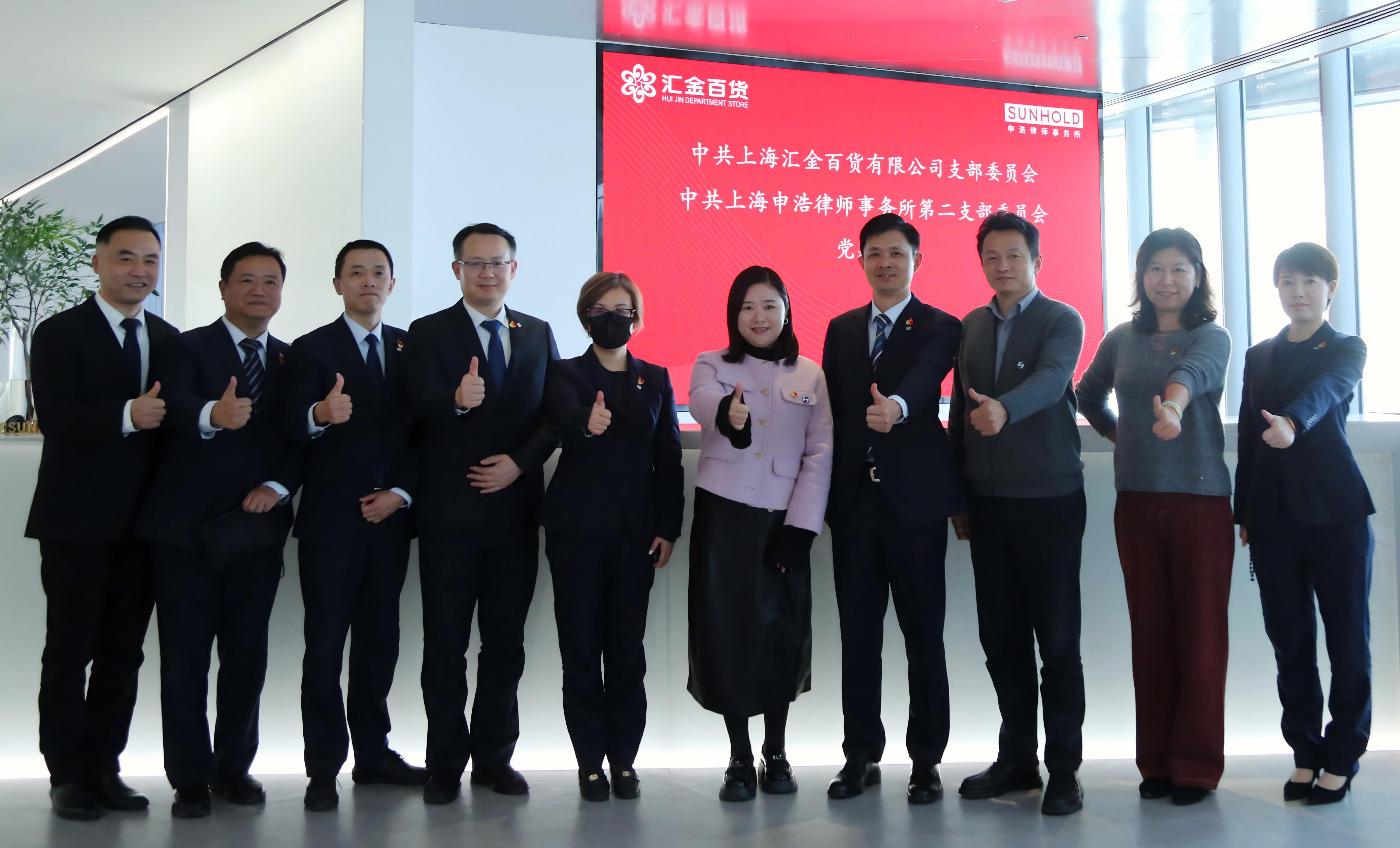 为进一步深化党建与业务深度融合,扩大党建共建“朋友圈”。12月19日,汇金百货党支部与上海申浩律师事务所第二党支部签订党建共建协议,依托商场平台资源与企业专业优势,实现双方资源共享、服务互补,推进高质量党建引领高质量发展。