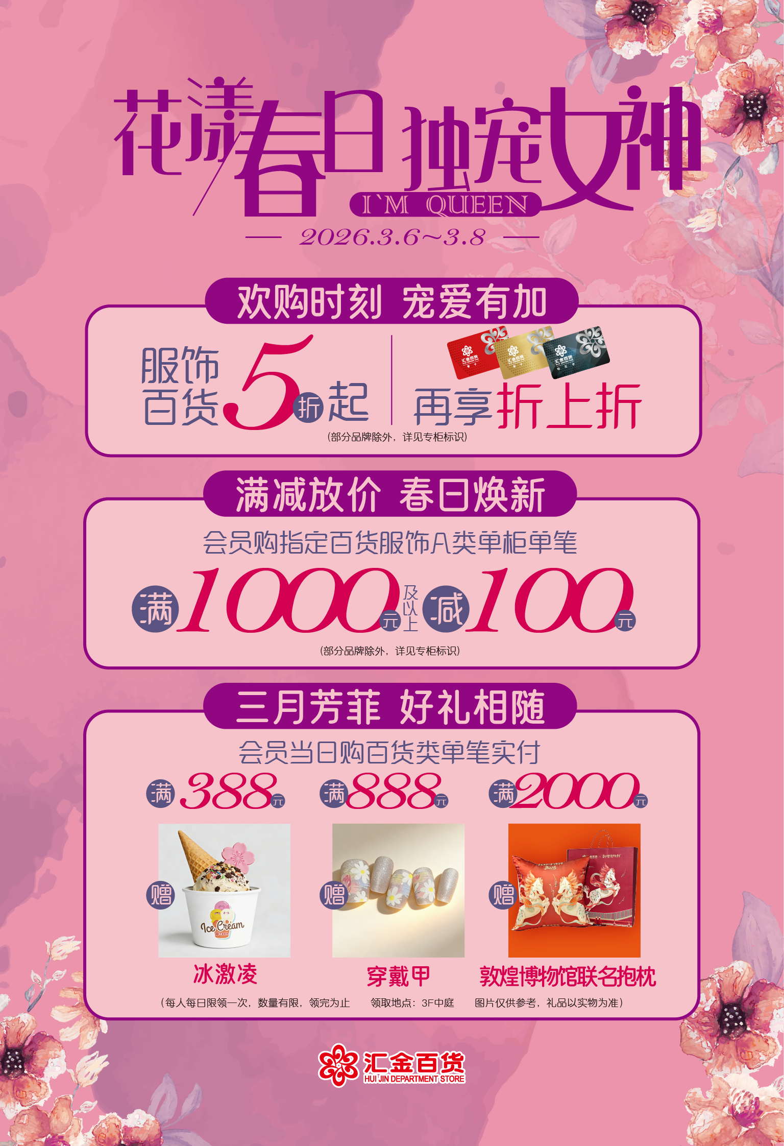 3月6日-3月8日,徐汇店开展“花漾春日,独宠女神”主题营销活动,会员百货类消费享三级赠礼,奖品包含冰淇淋、穿戴甲、敦煌博物馆抱枕等,让每一位消费者在焕新装扮的同时,收获满满仪式感与专属宠爱。